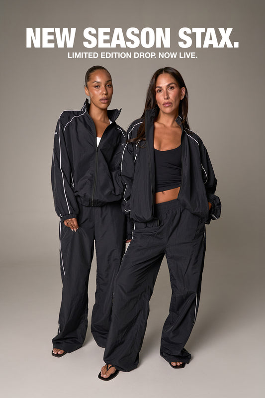 The Woven Track Pant: For that crisp, lightweight feel, our 100% Nylon track pants feature retro contrast trimming and a relaxed fit, making them the ultimate trans-seasonal essential.